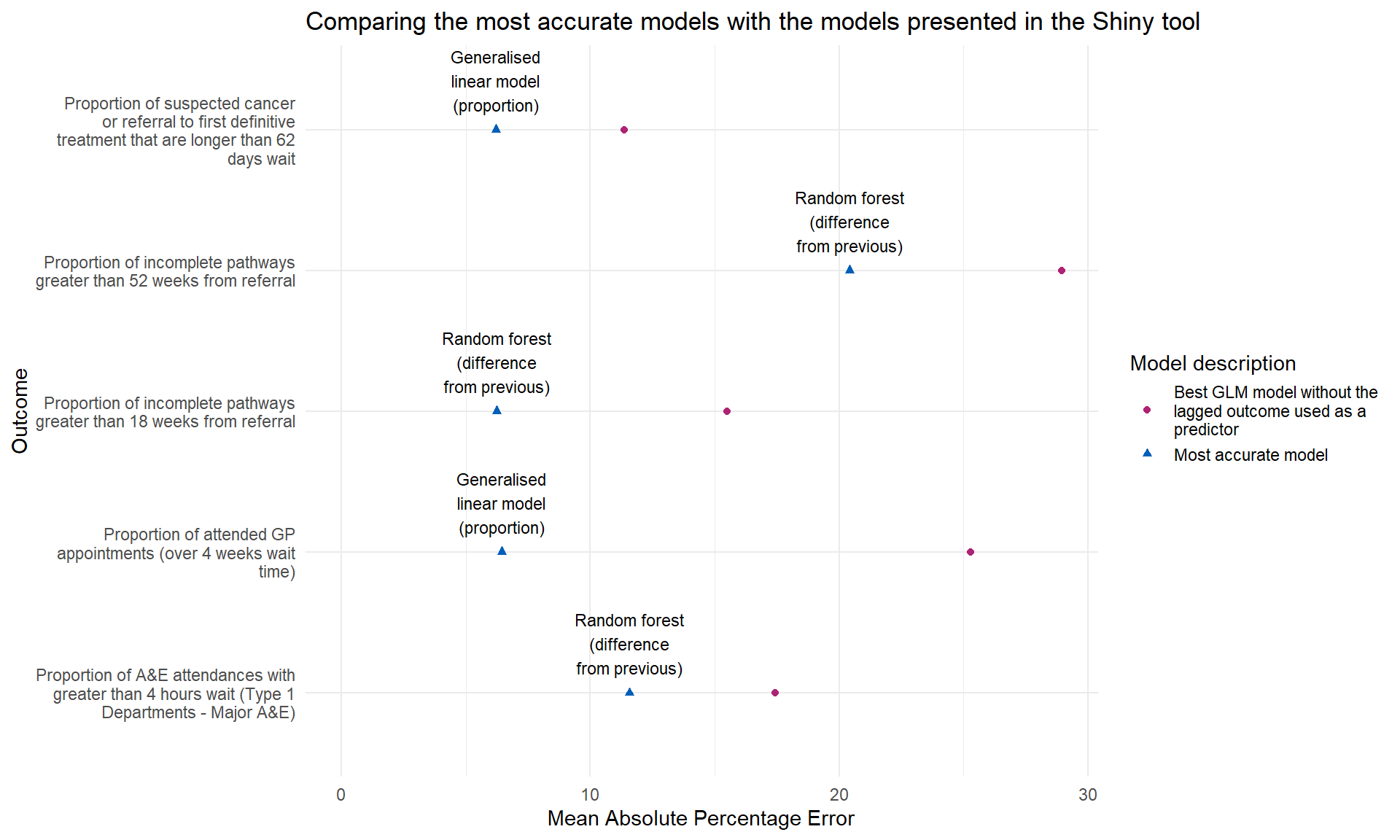 This has resulted in only presenting the generalised linear models through the Shiny application, where the target variable is not used as a predictor variable. Figure 1 shows how the models presented in the Shiny application compare with the best performing models.